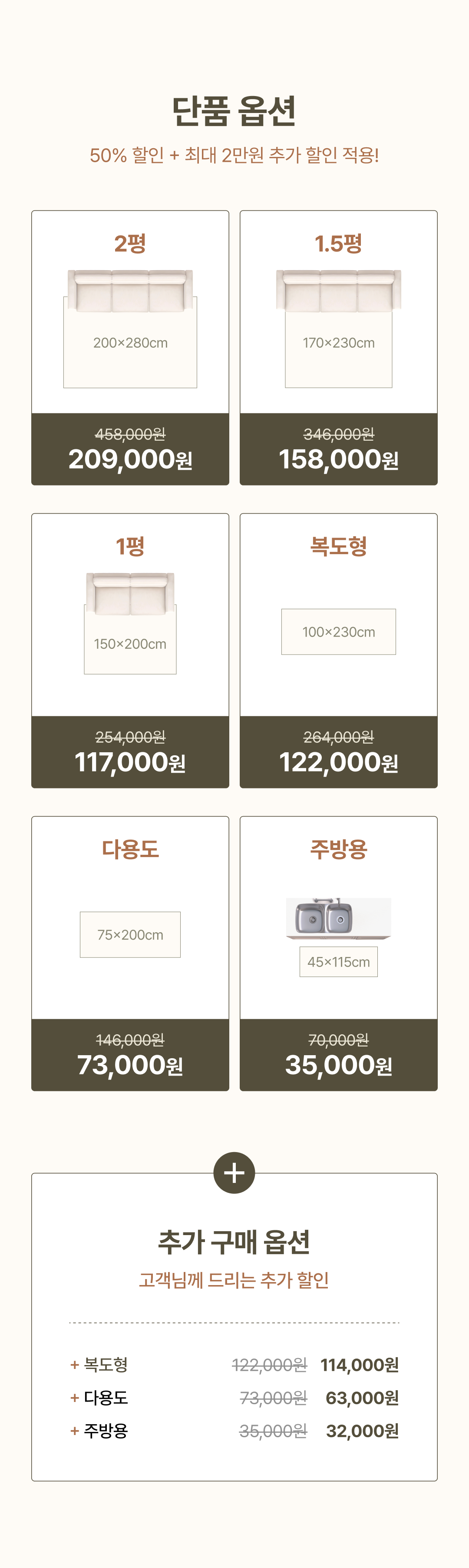 - 세트 구매 시 50% 할인 + 최대 60,000원 추가 중복할인 적용 - 다용도/복도형/주방용 추가옵션으로 구매 시 최대 10,000원 추가 할인 적용 ※준비된 물량이 소진 시 이벤트는 조기 마감되며, 이벤트 종료 후 가격이 인상될 예정입니다. |