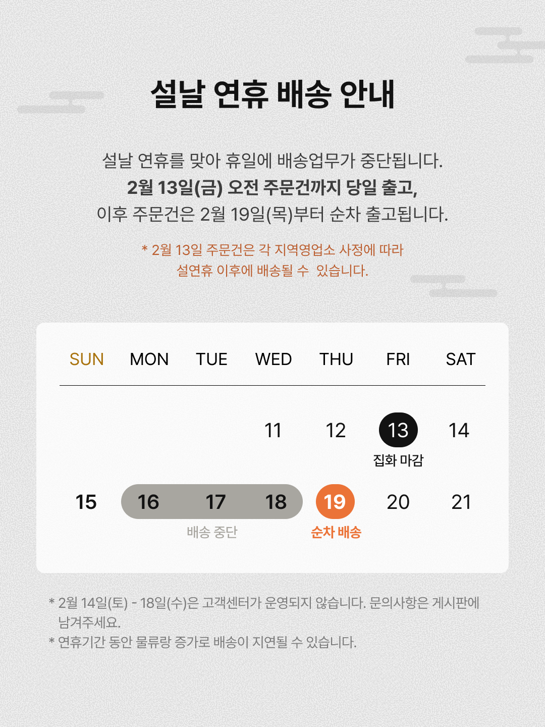- 점심 12시까지 주문 시 당일출고(영업일 기준) |