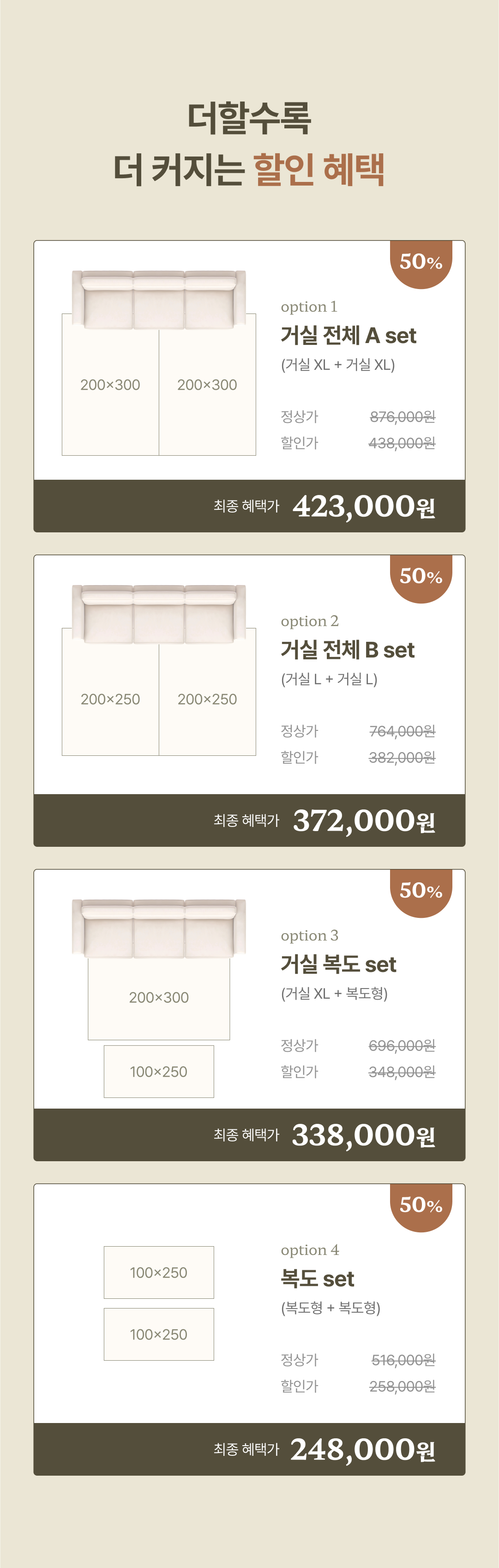 - 세트 구매 시 50% 할인 + 45,000원 추가 중복할인 적용