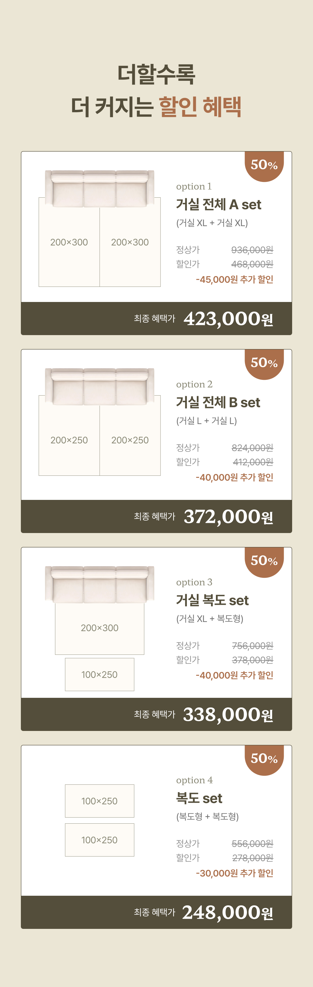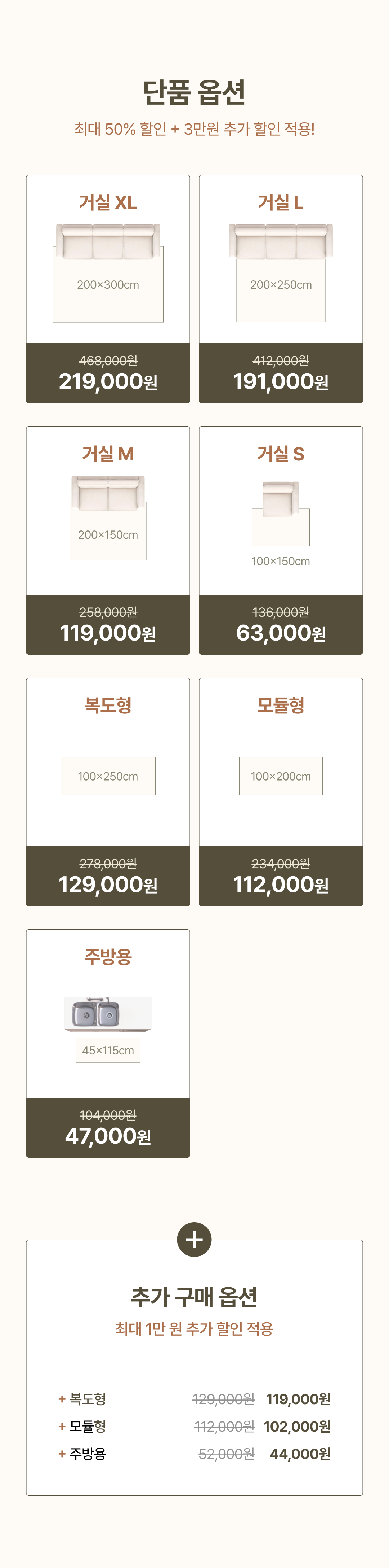 - 세트 구매 시 50% 할인 + 45,000원 추가 중복할인 적용 - 복도형/모듈형/주방용 추가옵션으로 구매 시 최대 10,000원 추가 할인 적용 ※준비된 물량이 소진 시 이벤트는 조기 마감되며, 이벤트 종료 후 가격이 인상될 예정입니다. |
